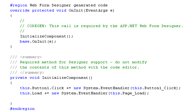 VS 2003 also then maintains a hidden region block inside the code-behind of tool-generated code to register event-handlers and keep them in sync with the design-surface: