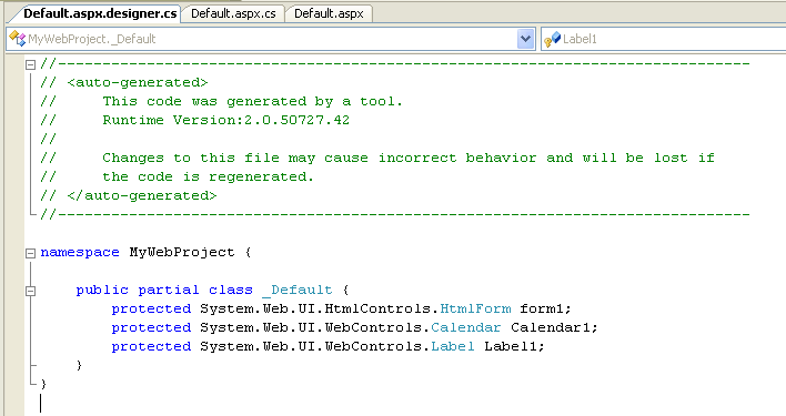 Because the MyWebProject._Default class is marked as "partial" in both of the above two files, the compiler will merge them into a single generated class at compile-time. This means that any variable, method or field generated in the default.aspx.designer.cs file can be used from the default.aspx.cs code-behind file (just as if it was declared in the code-behind file itself). For example, within the Page_Load event handler we could easily add the below code that uses the "Label1" and "Calendar1" control: