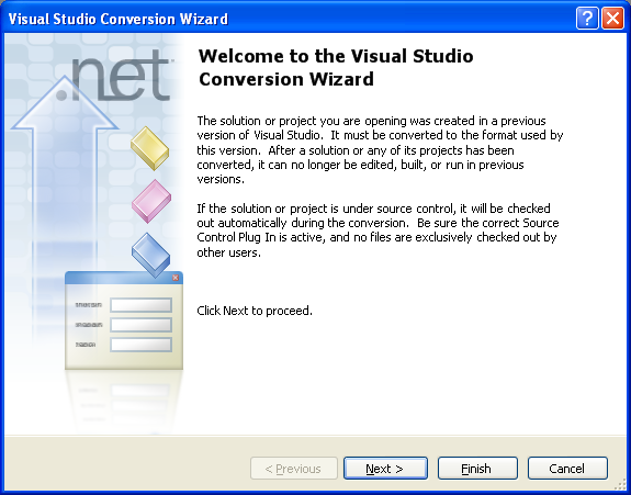 Close the solution in VS 2003, and start VS 2005. Choose "File->Open Project" from the File menu, and select the .sln or .csproj file for the solution you wish to migrate. This will cause the VS 2005 Migration Wizard dialog to launch: