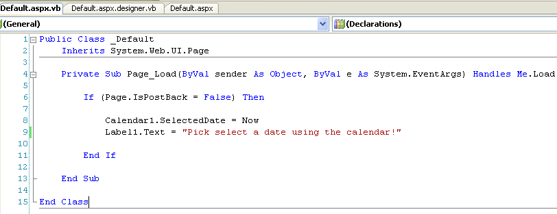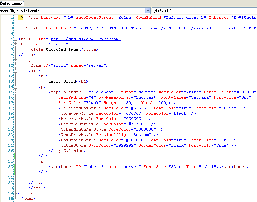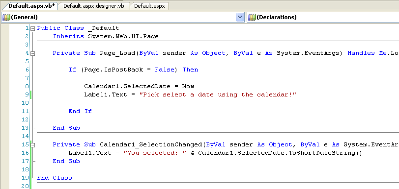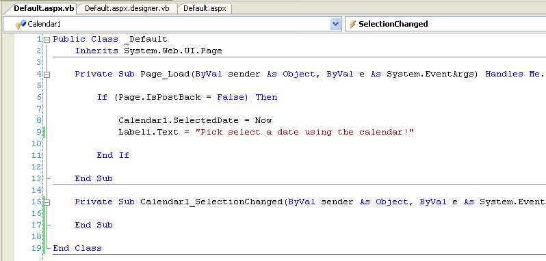 your code-behind to select a control (for example: "Calendar1") and then choose an event to handle
