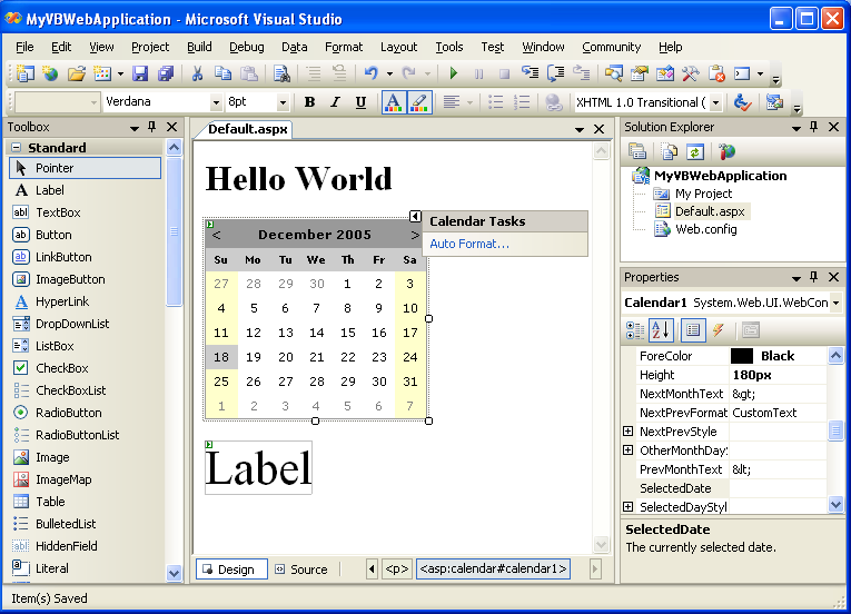 the page, along with a calendar server control and a label control (we'll use these in a later