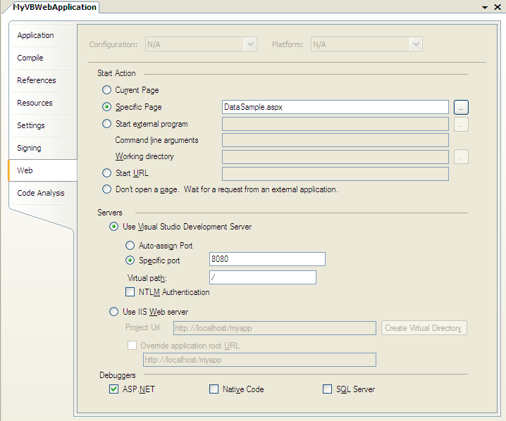 Application Projects are configured to launch and run using the built-in VS Web Server (aka Cassini)