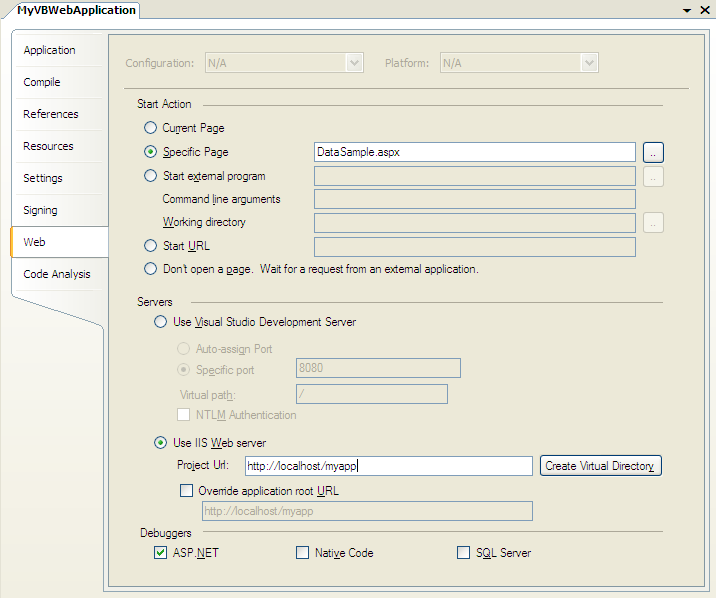 the above property page for the web project. When you hit F5 in the project, Visual