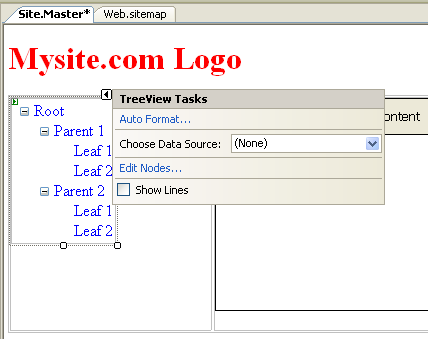 Note how the tree-view menu shows the current web.sitemap's hierarchy at design-time.