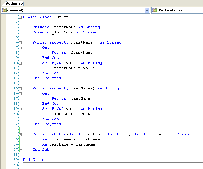 Make the new Author class public and then add some properties and constructors to it: