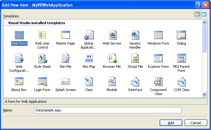 Right-click on the project and select Add->Add New Item to add a new ASP.NET Page called "DataSample.aspx"
