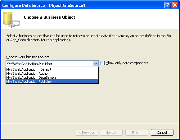 The below tutorial demonstrates how to build ASP.NET Pages that databind against Objects within VS 2005 Web